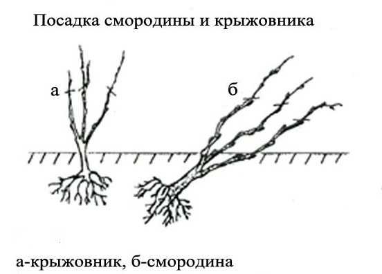Remarque! Contrairement aux groseilles à maquereau, il est recommandé de planter les groseilles en oblique, à un angle de 45 degrés. Dans ce cas, la racine doit regarder vers le sud et les pousses vers le nord.