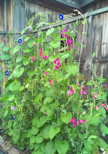 Si vous voulez faire un aménagement paysager vertical, alors une combinaison de gloire du matin et petits pois.