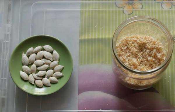 Une autre façon de faire germer les graines de citrouille est de germant dans la sciure de bois... Pour ce faire, vous devez verser la sciure de bois dans un bocal, verser de l'eau bouillante dessus et couvrir avec un couvercle.Ensuite, attendez un peu (pour que la température descende à la température ambiante) et ajoutez les graines dans le pot de sciure. Placez ensuite ce pot dans un sac en plastique et mettez-le dans un endroit chaud et sombre jusqu'à la germination.