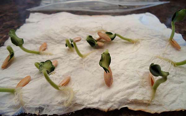 - Simplement germer! Pour ce faire, désinfectez d'abord, puis enveloppez-le dans un chiffon humide (ou mettez-le entre des cotons, des serviettes), mettez-le dans un sac en plastique (crée un effet de serre) et rangez-le pour la germination dans un endroit chaud, où la température est de + 24..28 degrés. En règle générale, les plants éclosent après 2-4 jours.