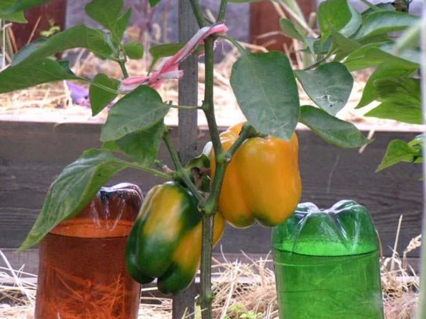 Alternativement, vous pouvez creuser des bouteilles d'eau (1,5-2 ou mieux 5 litres) dans le sol entre les poivrons, en y faisant des trous (dans les couvercles ou dans le fond), à partir desquels l'eau s'écoulera progressivement et humidifiera le sol sous les plantes.