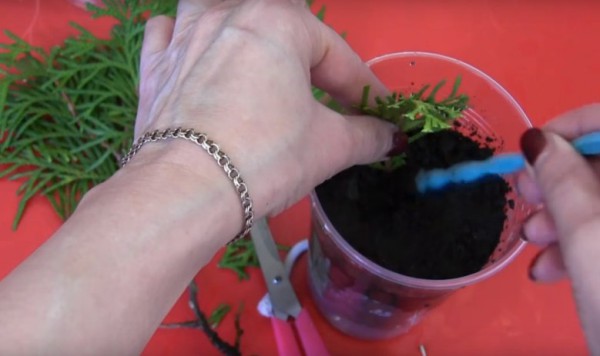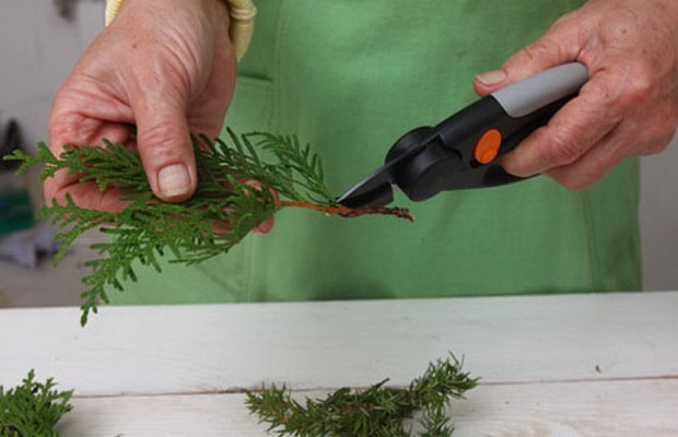 Tout d'abord, les aiguilles en excès doivent être retirées de la bouture afin d'éviter la pourriture. Pour ce faire, il est nécessaire de couper les branches du bas et de décoller légèrement l'écorce. Et avec une abondance de branches, vous pouvez raccourcir un peu les aiguilles ailleurs.