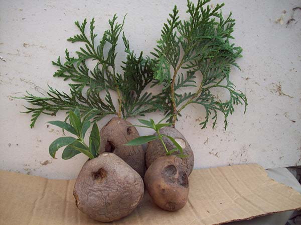 Pour ce faire, prenez quelques pommes de terre fraîches et saines, lavez, retirez les yeux, puis faites un trou d'environ 4 cm de long avec un clou. Après cela, vous devez placer la tige de thuya dans le trou de la pomme de terre. Versez un peu de terre fertile dans des caisses en bois et placez les pommes de terre dans le sol.Couvrir le ragoût de pommes de terre avec une bouteille en plastique recadrée. Ensuite, vous pouvez dévisser le bouchon de la bouteille et l'eau.