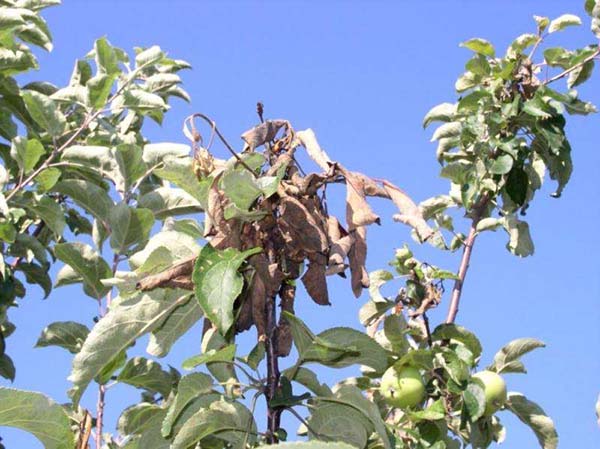 Si les feuilles du pommier en premier recroquevillé, une puis et pas du tout séché brusquement (comme s'ils avaient été incendiés), alors vous devriez savoir - c'est une brûlure moniliale. En outre, cette maladie fongique affecte les fruits: les pommes commencent à pourrir directement sur l'arbre (ce phénomène s'appelle pourriture des fruits).