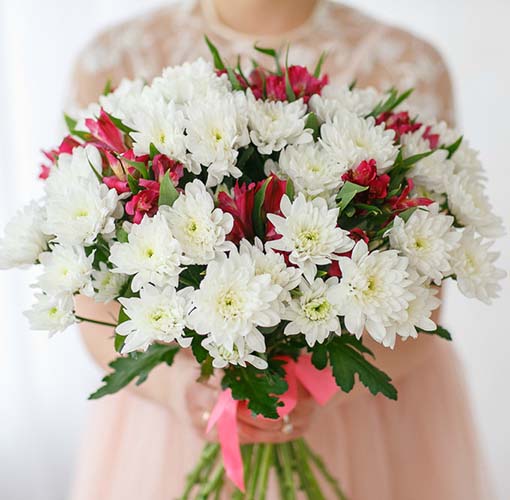 Si vous souhaitez offrir à une femme une composition de plusieurs fleurs le 8 mars, gardez à l'esprit que le chrysanthème a l'air avantageux avec les plantes suivantes: