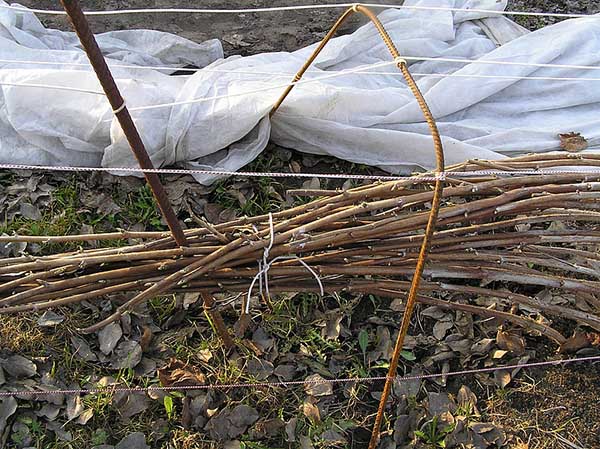 Le sol du site et les branches courbées sont recouverts de paille sèche ou de feuillage. Au lieu d'un paillis organique, les tiges peuvent être enveloppées de polyéthylène, spunbond.