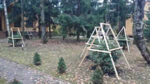 - placez 3-4 petites lattes avec une cabane (ou des piquets en forme de wigwam) sur votre buisson ou arc (mais il est préférable de faire un cadre en forme de cône pour que la neige ne s'attarde pas);