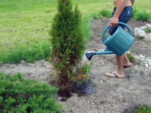 Arrosage régulier vous devez fournir le thuya qui pousse dans la région, qui se caractérise par un automne sec. Avant le début des gelées, l'arrosage doit être particulièrement abondant (irrigation de charge d'eau): les racines seront saturées d'humidité pendant une longue période, un morceau de terre humide gèlera plus longtemps, ce qui sauvera le rhizome des températures de gel, en conséquence, le thuya sera plus résistant aux changements de conditions de température en hiver. Si l'automne est plein de pluies, le conifère n'est pratiquement pas arrosé en plus (sauf pour l'irrigation finale avec remplissage d'eau).