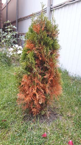 De plus, cela (jaunissement dû au stress) se produira sûrement si le thuya n'a pas le temps de s'adapter à un nouvel endroit lors de la plantation au début de l'automne ou à la fin de l'été.