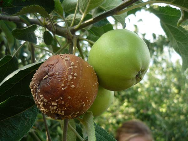 - moniliose ou pourriture moniliale (les pommes pourrissent directement sur l'arbre);
