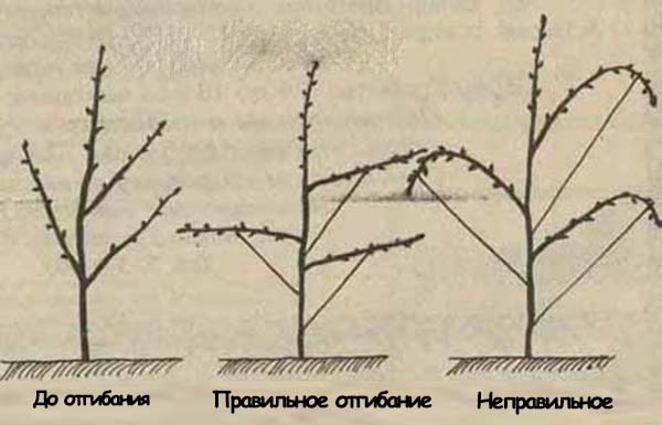 Au printemps, lorsque les bourgeons commencent à gonfler (c'est-à-dire après le début de l'écoulement de la sève), vous devrez amener les branches à la position horizontale maximale (l'angle doit être supérieur à 45 degrés, de préférence plus proche de 60 degrés).