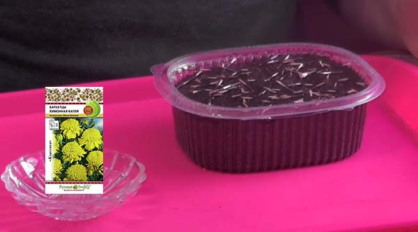 - Répartissez doucement les graines sur la surface. Ce n'est pas effrayant si les plants sont très épais, le velours (tagetis) tolère parfaitement une pioche.