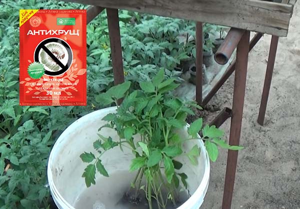 C'est également possible à l'avance (un jour avant le débarquement)traiter les semis tomate des ravageurs. Il est optimal de le faire bien avant l'apparition des fruits, de sorte qu'au moment de la récolte, toute la préparation soit depuis longtemps retirée de la plante.Selon les maraîchers expérimentés, le médicament "Antichrushch" se montre bien, qui protège contre les coléoptères, les vers fil-de-fer, ours, aleurode des serres.